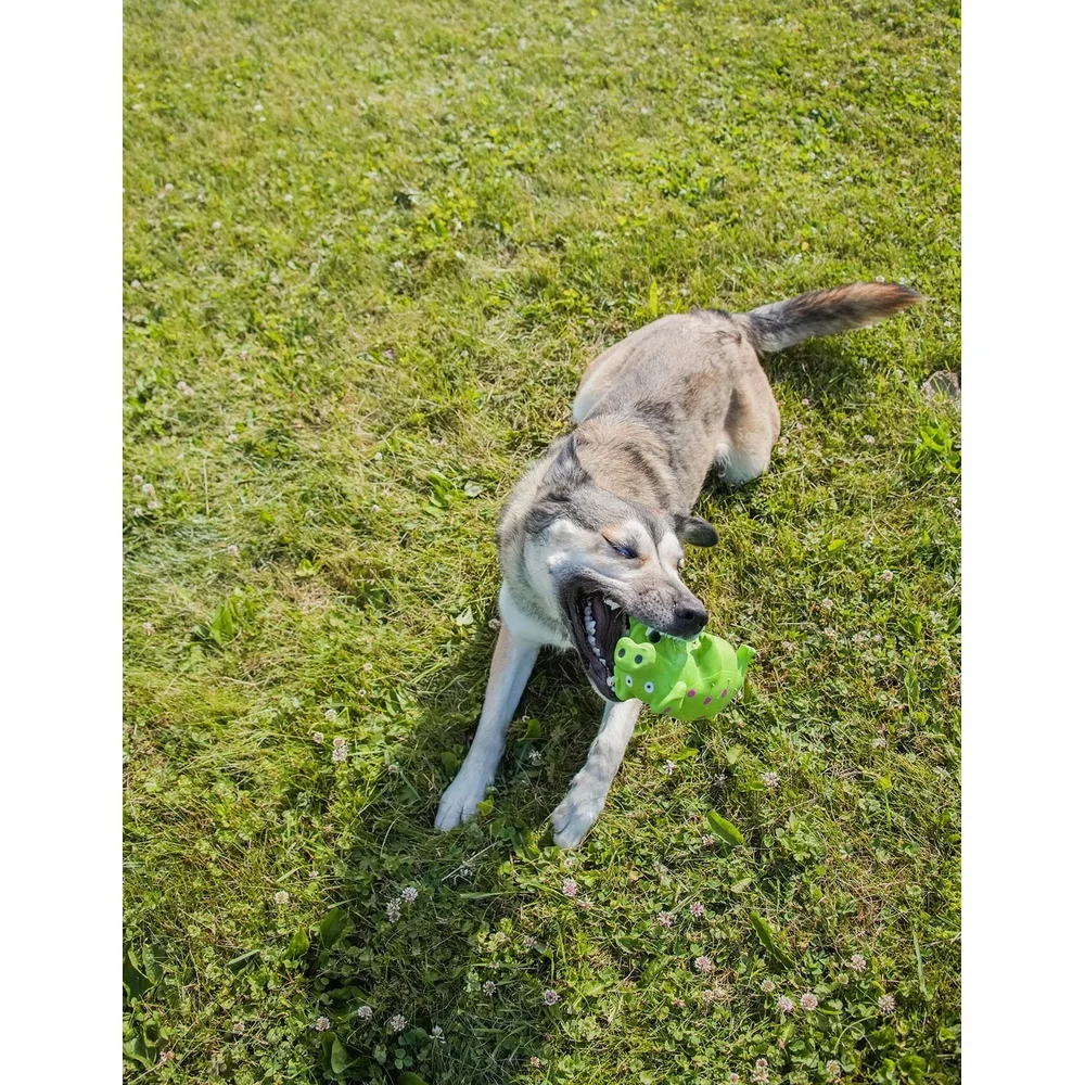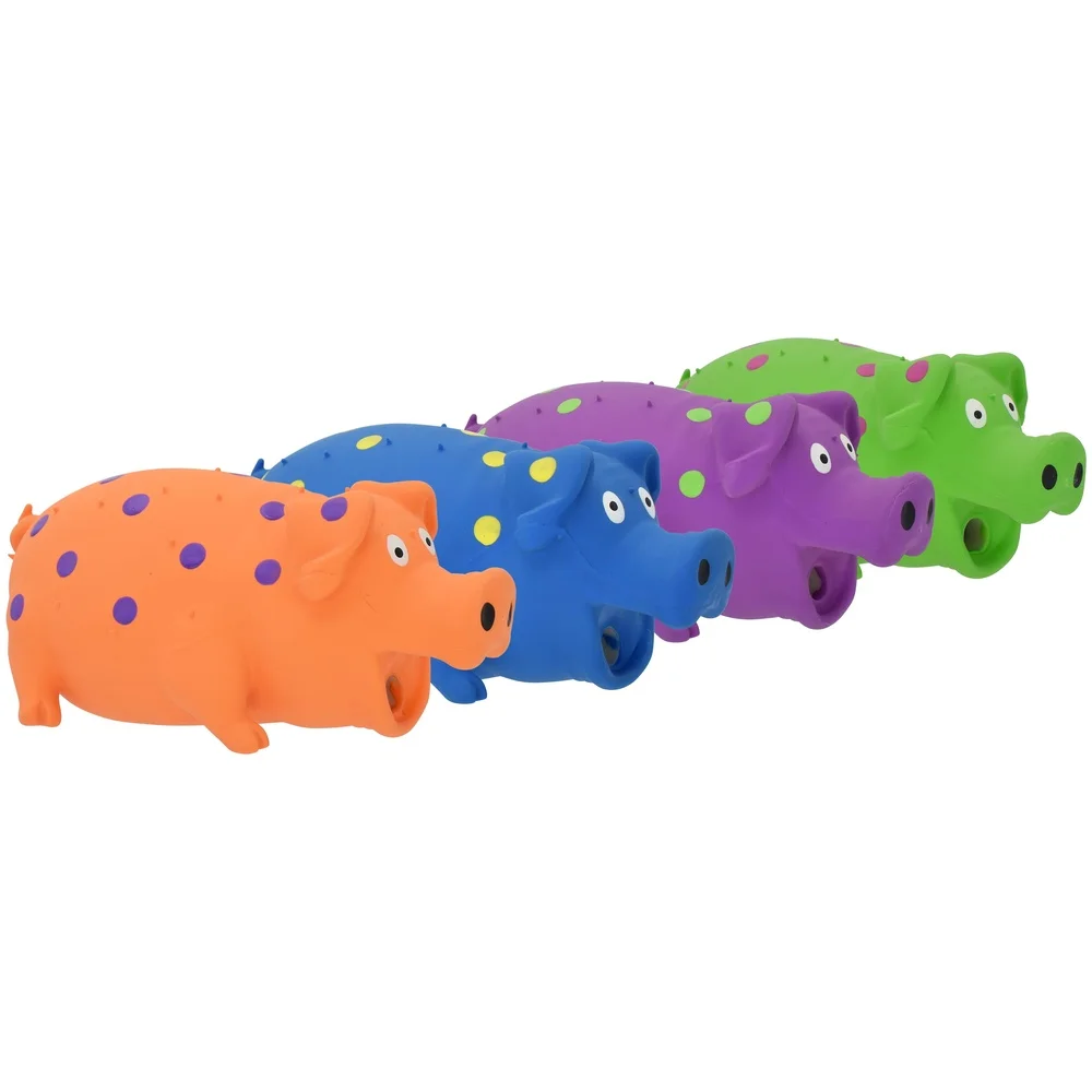 Their trademarked polka dot designed toy is made of latex and has a plush fiber stuffing inside for schew texture. The squeaker makes a life-like grunting noise. The latex outer material is easy to clean and great for gentle chewers. Not for dogs that like to rip apart toys. These are great for dogs of all ages and sizes and are available in a variety of assorted vibrant colors. These toy are polka-dot covered latex material with a plush filling. Your pup will make the inner squeaker grunt with each squeeze. The sound it makes is life-like and the sounds will keep your pooch entertained and entice play. The grunting pig comes in an assortment of colors. The fiber filling gives it a great chew texture. Not recommended for dogs that like to rip toys apart. As with all pet toys, monitor your pet when playing with toys and discard if they get torn or worn.