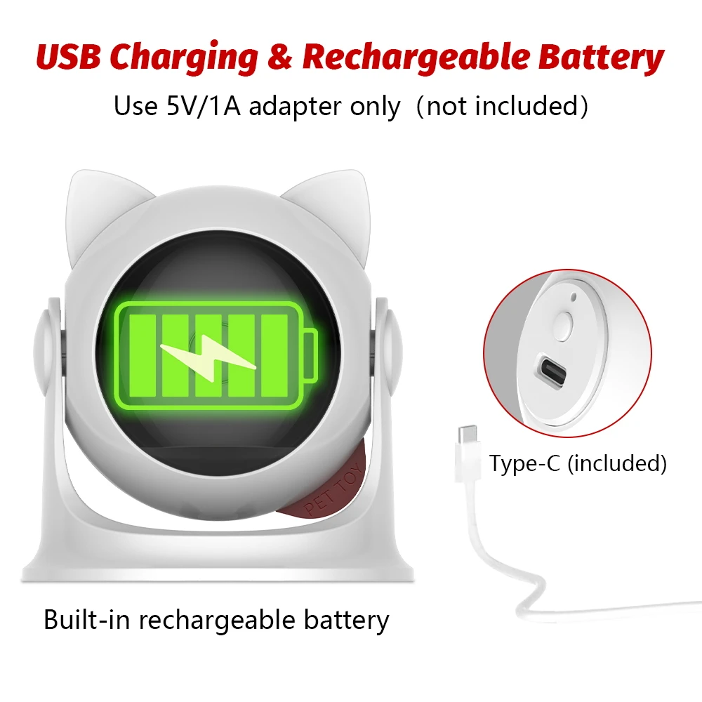 Rechargeable battery:This indoor cat toy built-in rechargeable battery, using the included USB cable.Fully charged about 2 hrs